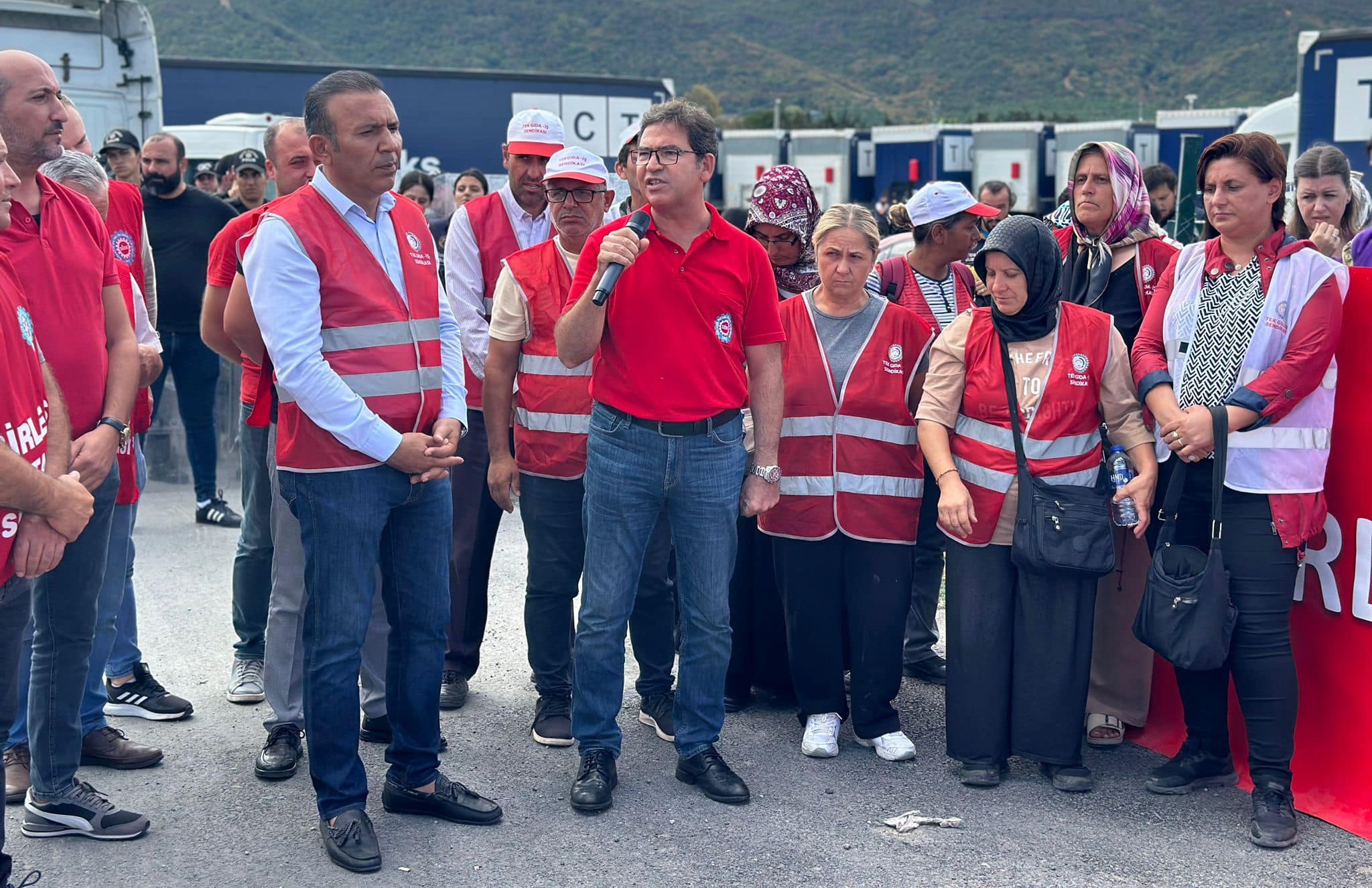 “…Burada bir süre önce yapılan Çalışma Bakanlığı denetimde Çalışma Genel Müdürü ve Çalışma Bakan Yardımcısının bizzat işyerinde yapmış olduğu incelemede; burada sendikal hak ihlallerini çok açık ve net olarak ortaya koydular. O zaman; mademki bu patron anayasayı ihlal ediyorsa, mademki bu patron yasaları çiğneyip işçinin en temel hakkını gasp ediyorsa bu barikatı patronlara kuracaksınız” dedi.