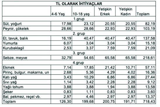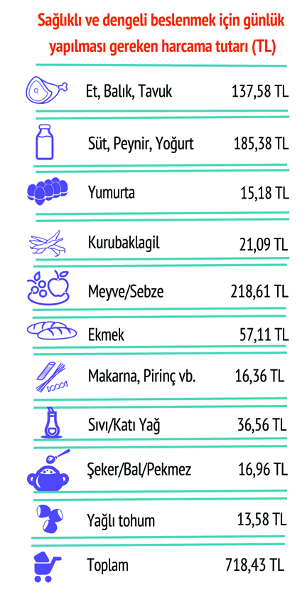 Sağlıklı ve dengeli beslenmek için her aile ferdinin alması gereken kalori miktarı farklılık göstermektedir. Yetişkin bir erkeğin sağlıklı ve dengeli beslenmesi için tüketmesi gereken gıdaların aylık karşılığı 6.022 liradır. Bu değer yetişkin bir kadın için 5.751, 15-18 yaş bir genç için 5.990, 4-6 yaş arası bir çocuk için 3.789 liradır. Sağlıklı bir biçimde beslenmenin toplam aile bütçesine maliyeti ise 21 bin 553 lira olarak tespit edilmiştir. Bu tutar söz konusu ailenin sadece gıda için yapması gereken zorunlu harcama tutardır. Eğitim, sağlık, barınma, eğlence, ısınma, ulaşım gibi giderler ile birlikte bir ailenin yapması gereken harcama tutarı 74 bin 552 liraya ulaşmaktadır.