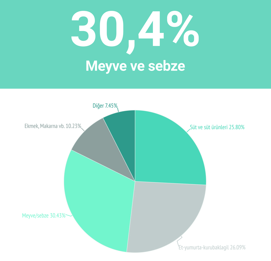 Daha dar bir gruplandırmaya göre harcamalarda meyve ve sebze yüzde 30.4 ile ilk sıradayken, süt ve süt ürünleri grubununun payı yüzde 25.8'dir. Et, yumurta ve kurubaklagil grubunun payı ise yüzde 25.8 olarak tespit edildi. Ekmek, makarna vb.'nin toplam içindeki payı yüzde 10.23, diğer gıda harcamalarının toplam içindeki payı ise yüzde 7.45 oldu.