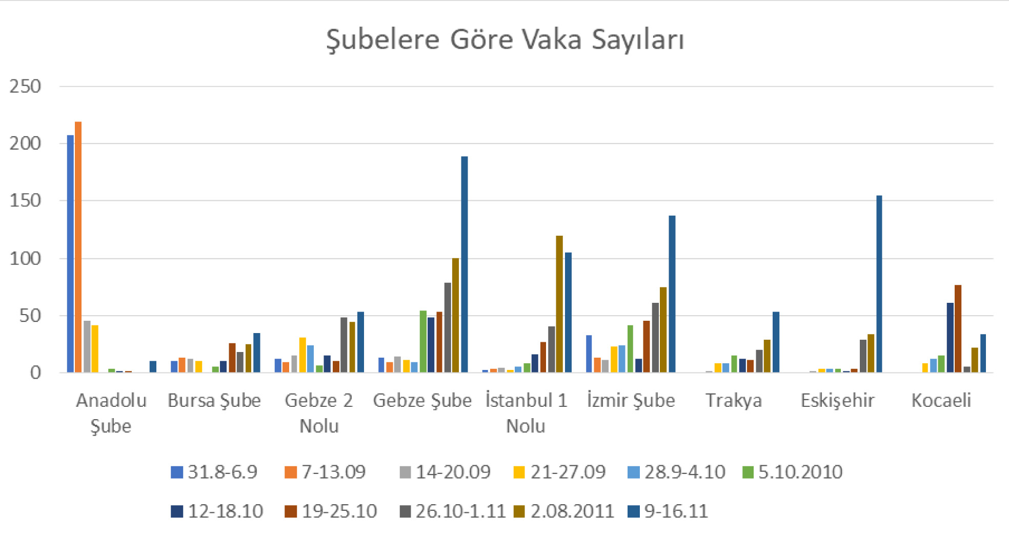 31 Ağustos-6 Eylül 2020 haftasında vaka sayısı 207’si Mersin, Kırşehir ve Ankara’da kurulu olan 3 fabrikada olmak 278 olarak tespit edilmiştir. Bu işyerlerinde salgının kontrol edilmesi ile birlikte 28 Eylül-4 Ekim 2020 tarihlerinde aktif vaka sayısı 88’e gerilemiştir. Ancak bu haftadan itibaren işyerlerindeki aktif vaka sayısı hızlı bir artış kaydetmiştir. 9-16 Kasım 2020 Haftası’ndaki aktif vaka sayısı 771 ile 28 Eylül-4 Ekim 2020 haftasının aktif vaka sayısının yaklaşık 9 katıdır. Aktif vaka sayısında bu dönemde yaşanan artış büyük oranda, üye yoğunluğunun olduğu, Gebze ve İstanbul Anadolu yakasındaki işyerlerindeki artıştan kaynaklanmıştır. Bu dönemde aktif vaka sayısı söz konusu bölgelerde 39’dan 347’ye fırlamıştır. Bu dönemde Covid 19 tanısı konulmuş işçi sayısının %30’a ulaştığı işyerlerimiz olmuştur.