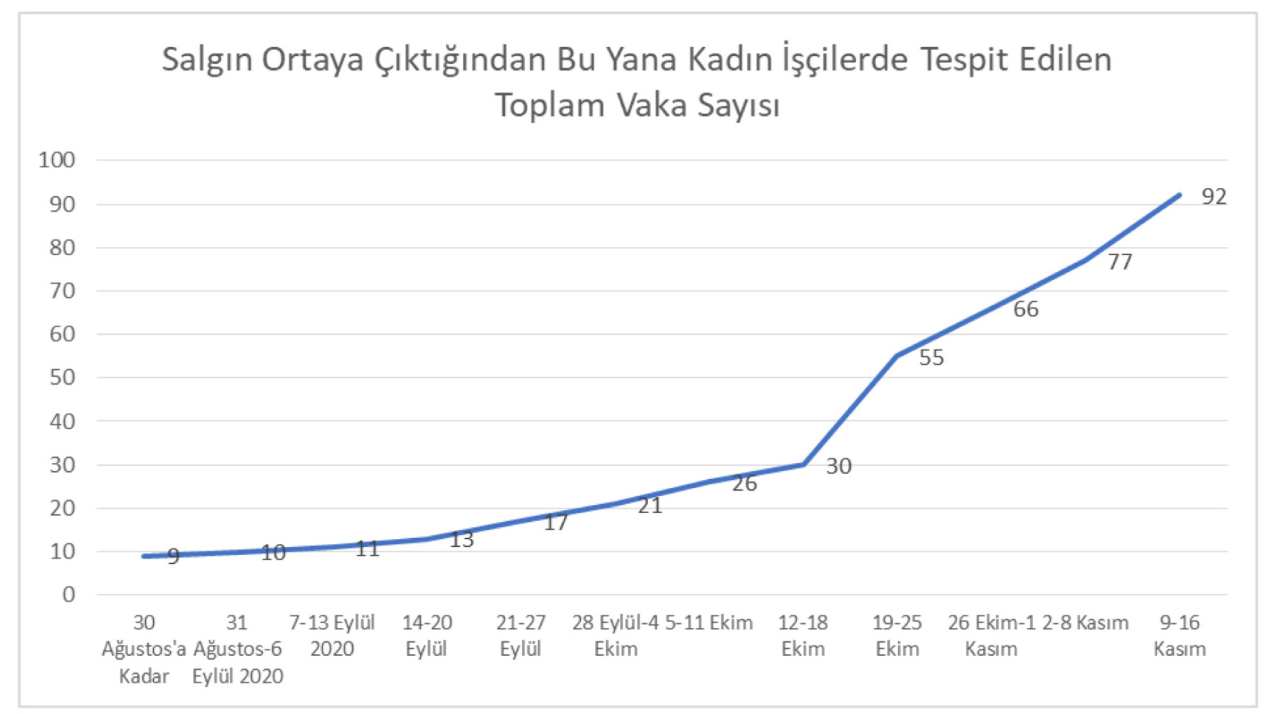 Sendikanın örgütlü olduğu işyerlerinde kadın işçilerde de vaka sayısı hızla artmaktadır. 30 Ağustos’a kadar görülen vaka sayısı sadece 9 iken bu tarihten itibaren yaklaşık 9 kat artarak 92’ye yükseldi.