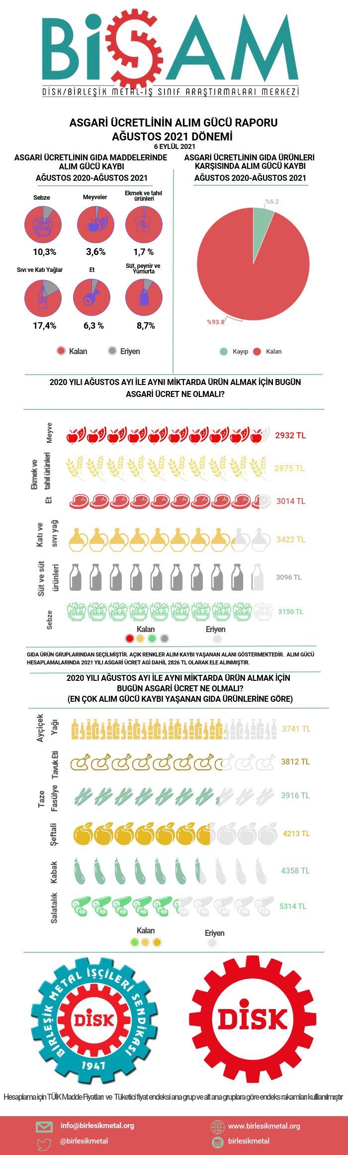 Birleşik Metal İşçileri Sendikası Sınıf Araştırmaları Merkezi (BİSAM) olarak, TÜİK (Türkiye İstatistik Kurumu) Madde Fiyatları, Tüketici Fiyat Endeksi (2003=100) ana grup ve alt ana gruplara göre endeks rakamları üzerinden yaptığımız hesaplamaya göre asgari ücretli hemen hemen tüm gıda gruplarında alım gücünü kaybetti. En fazla alım gücü kaybı yaşanan gıda grubu yüzde 17.4 ile sıvı ve katı yağlar olurken, sebzelerde alım gücü kaybı yüzde 10.3’e ulaştı. Asgari ücretlinin geçen yılın aynı ayına göre süt, peynir ve yumurta grubunda da yüzde 8.7’lik bir kaybı söz konusu. Ette alım gücü kaybı yüzde 6.3 iken meyvede bu oran yüzde 3.6, ekmek ve tahıl ürünlerinde yüzde 1.7 olarak gerçekleşti.