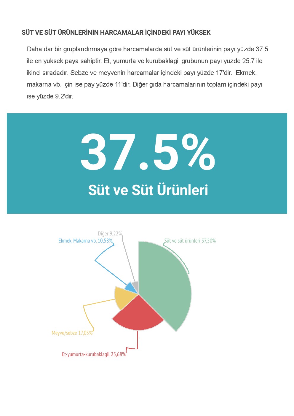 Daha dar bir gruplandırmaya göre harcamalarda süt ve süt ürünlerinin payı yüzde 37.5 ile en yüksek paya sahiptir. Et, yumurta ve kurubaklagil grubunun payı yüzde 25.7 ile ikinci sıradadır. Sebze ve meyvenin harcamalar içindeki payı yüzde 17'dir. Ekmek, makarna vb. için ise pay yüzde 11'dir. Diğer gıda harcamalarının toplam içindeki payı ise yüzde 9.2'dir.