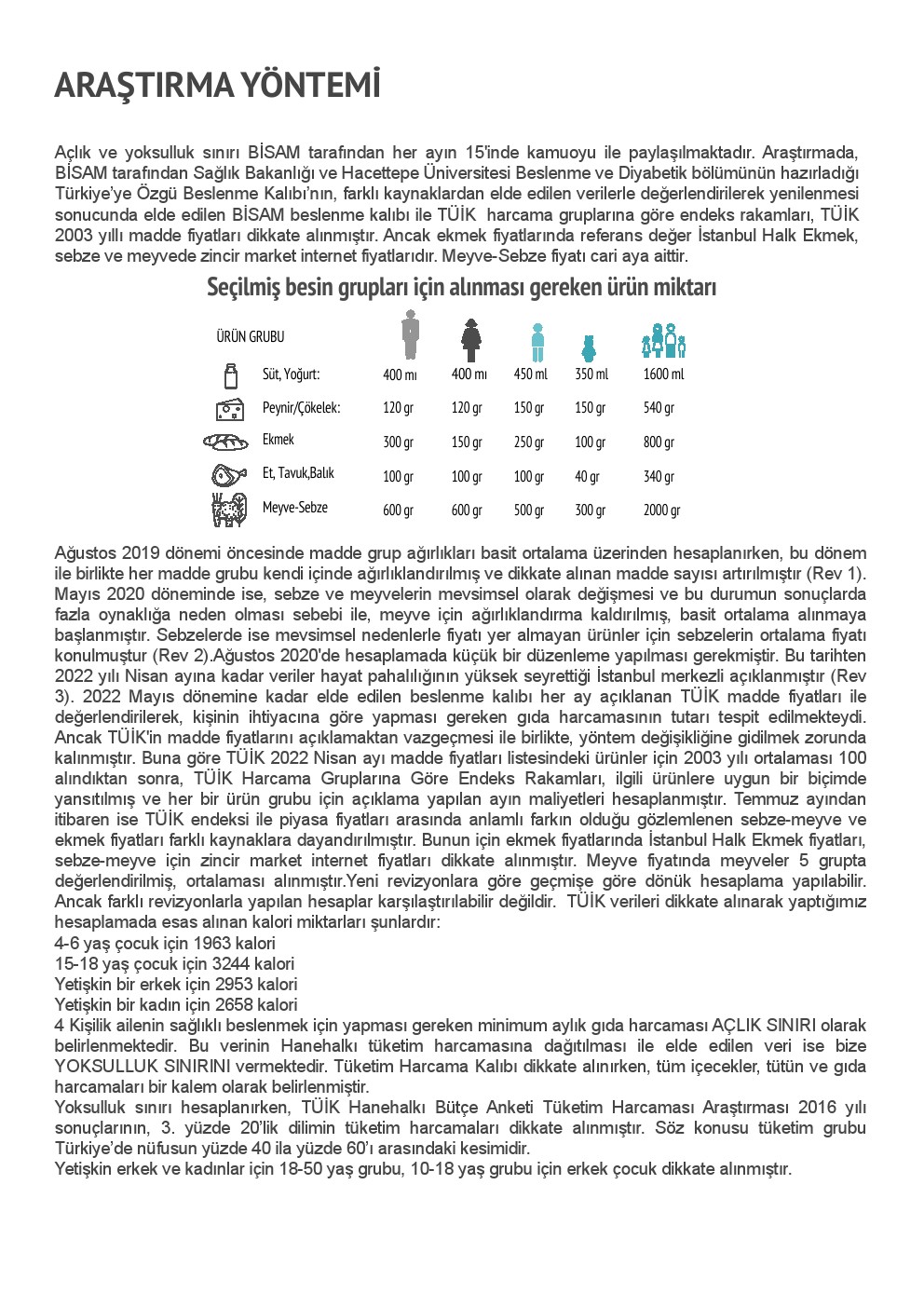 Ağustos 2019 dönemi öncesinde madde grup ağırlıkları basit ortalama üzerinden hesaplanırken, bu dönem ile birlikte her madde grubu kendi içinde ağırlıklandırılmış ve dikkate alınan madde sayısı artırılmıştır (Rev 1). Mayıs 2020 döneminde ise, sebze ve meyvelerin mevsimsel olarak değişmesi ve bu durumun sonuçlarda fazla oynaklığa neden olması sebebi ile, meyve için ağırlıklandırma kaldırılmış, basit ortalama alınmaya başlanmıştır. Sebzelerde ise mevsimsel nedenlerle fiyatı yer almayan ürünler için sebzelerin ortalama fiyatı konulmuştur (Rev 2).Ağustos 2020'de hesaplamada küçük bir düzenleme yapılması gerekmiştir. Bu tarihten 2022 yılı Nisan ayına kadar veriler hayat pahalılığının yüksek seyrettiği İstanbul merkezli açıklanmıştır (Rev 3). 2022 Mayıs dönemine kadar elde edilen beslenme kalıbı her ay açıklanan TÜİK madde fiyatları ile değerlendirilerek, kişinin ihtiyacına göre yapması gereken gıda harcamasının tutarı tespit edilmekteydi. Ancak TÜİK'in madde fiyatlarını açıklamaktan vazgeçmesi ile birlikte, yöntem değişikliğine gidilmek zorunda kalınmıştır. Buna göre TÜİK 2022 Nisan ayı madde fiyatları listesindeki ürünler için 2003 yılı ortalaması 100 alındıktan sonra, TÜİK Harcama Gruplarına Göre Endeks Rakamları, ilgili ürünlere uygun bir biçimde yansıtılmış ve her bir ürün grubu için açıklama yapılan ayın maliyetleri hesaplanmıştır. Temmuz ayından itibaren ise TÜİK endeksi ile piyasa fiyatları arasında anlamlı farkın olduğu gözlemlenen sebze-meyve ve ekmek fiyatları farklı kaynaklara dayandırılmıştır. Bunun için ekmek fiyatlarında İstanbul Halk Ekmek fiyatları, sebze-meyve için zincir market internet fiyatları dikkate alınmıştır. Meyve fiyatında meyveler 5 grupta değerlendirilmiş, ortalaması alınmıştır.Yeni revizyonlara göre geçmişe göre dönük hesaplama yapılabilir. Ancak farklı revizyonlarla yapılan hesaplar karşılaştırılabilir değildir. TÜİK verileri dikkate alınarak yaptığımız hesaplamada esas alınan kalori miktarları şunlardır: