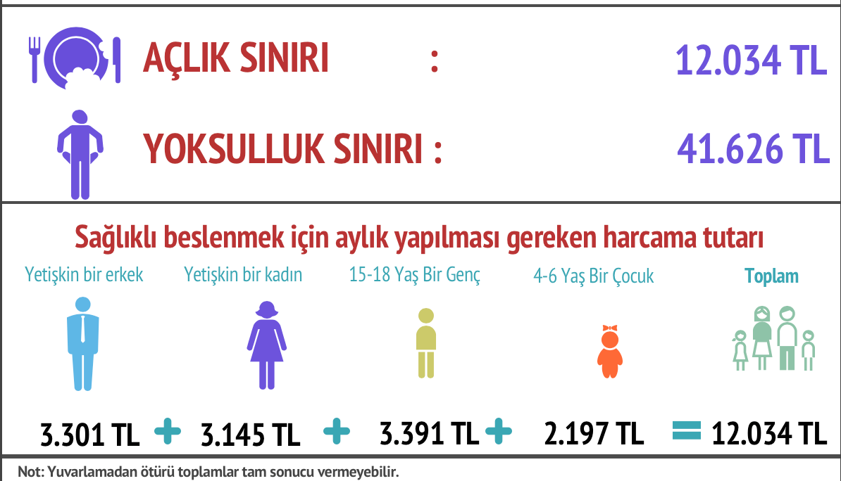 Sağlıklı beslenmek için her aile ferdinin alması gereken kalori miktarı farklılık göstermektedir. Yetişkin bir erkeğin sağlıklı ve dengeli beslenmesi için tüketmesi gereken gıdaların aylık karşılığı 3.301 liradır. Bu değer yetişkin bir kadın için 3.145, 15-18 yaş bir genç için 3.391, 4-6 yaş arası bir çocuk için 2.197 liradır. Sağlıklı bir biçimde beslenmenin toplam aile bütçesine maliyeti ise 12 bin 34 lira olarak tespit edilmiştir. Bu tutar söz konusu ailenin sadece gıda için yapması gereken zorunlu harcama tutardır. Eğitim, sağlık, barınma, eğlence, ısınma, ulaşım gibi giderler ile bir ailenin yapması gereken harcama tutarı 41 bin 626 liraya ulaşmaktadır.