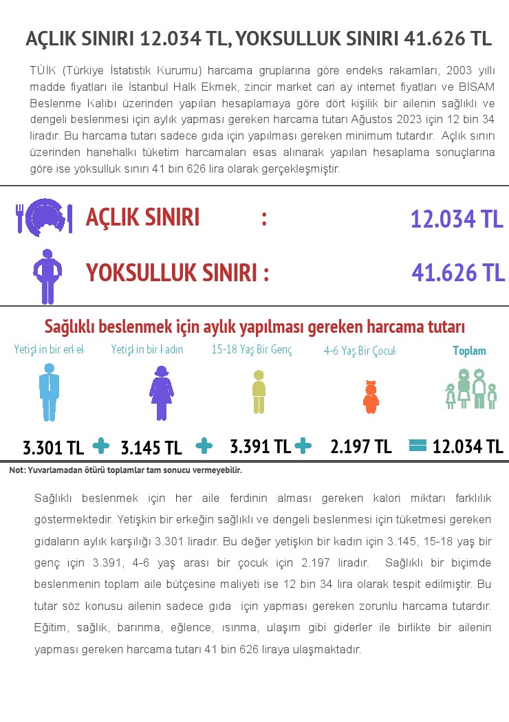 TÜİK (Türkiye İstatistik Kurumu) harcama gruplarına göre endeks rakamları, 2003 yıllı madde fiyatları ile İstanbul Halk Ekmek, zincir market cari ay internet fiyatları ve BİSAM Beslenme Kalıbı üzerinden yapılan hesaplamaya göre dört kişilik bir ailenin sağlıklı ve dengeli beslenmesi için aylık yapması gereken harcama tutarı Ağustos 2023 için 12 bin 34 liradır. Bu harcama tutarı sadece gıda için yapılması gereken minimum tutardır. Açlık sınırı üzerinden hanehalkı tüketim harcamaları esas alınarak yapılan hesaplama sonuçlarına göre ise yoksulluk sınırı 41 bin 626 lira olarak gerçekleşmiştir.