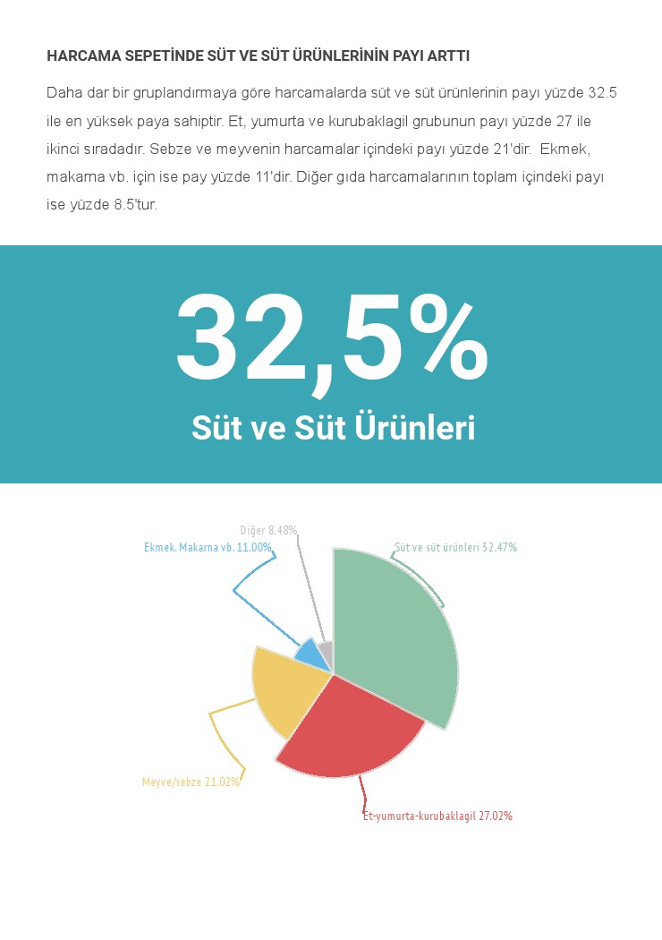 Daha dar bir gruplandırmaya göre harcamalarda süt ve süt ürünlerinin payı yüzde 32.5 ile en yüksek paya sahiptir. Et, yumurta ve kurubaklagil grubunun payı yüzde 27 ile ikinci sıradadır. Sebze ve meyvenin harcamalar içindeki payı yüzde 21'dir. Ekmek, makarna vb. için ise pay yüzde 11'dir. Diğer gıda harcamalarının toplam içindeki payı ise yüzde 8.5'tur.