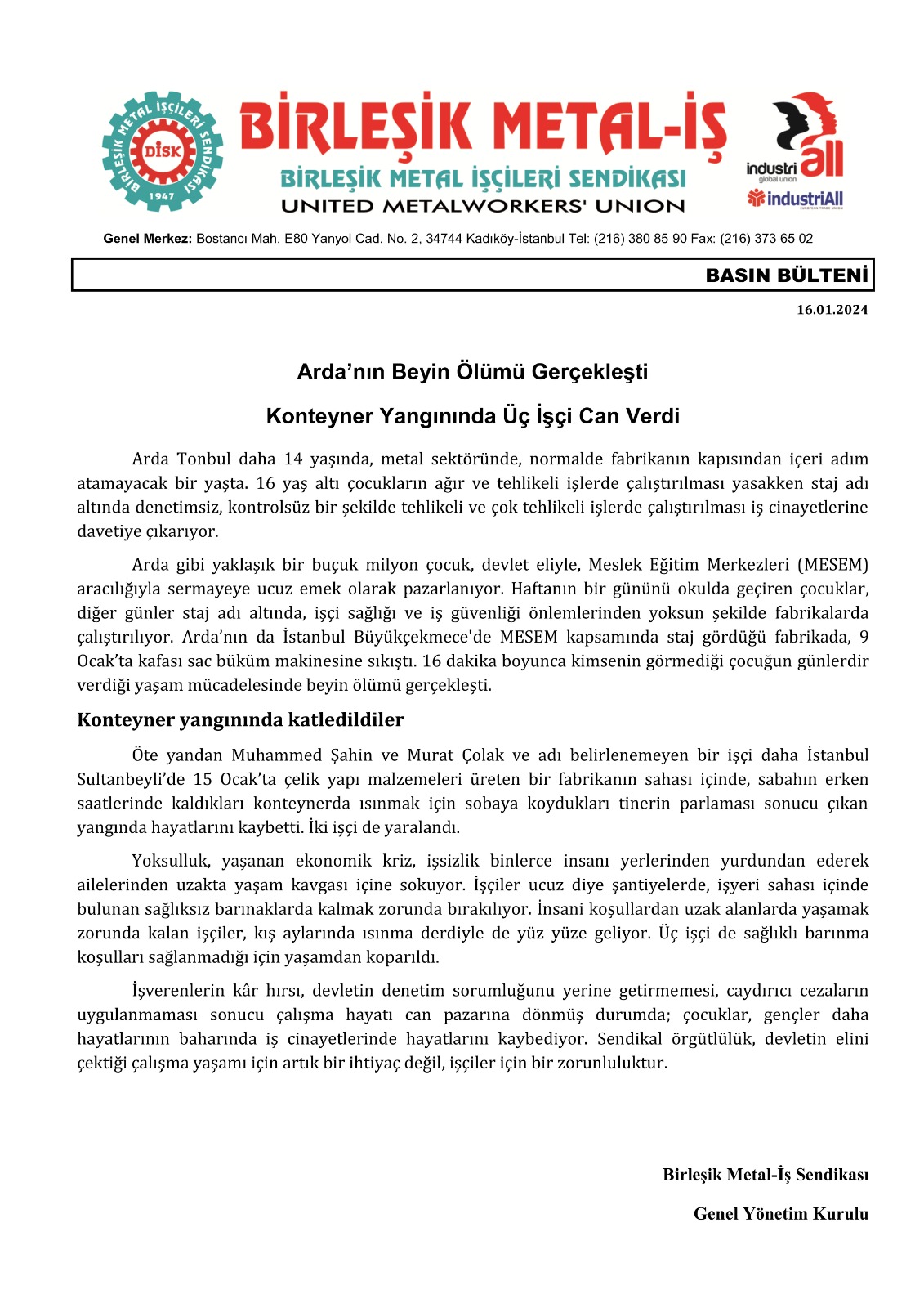 İşverenlerin kâr hırsı, devletin denetim sorumluğunu yerine getirmemesi, caydırıcı cezaların uygulanmaması sonucu çalışma hayatı can pazarına dönmüş durumda; çocuklar, gençler daha hayatlarının baharında iş cinayetlerinde hayatlarını kaybediyor. Sendikal örgütlülük, devletin elini çektiği çalışma yaşamı için artık bir ihtiyaç değil, işçiler için bir zorunluluktur.
