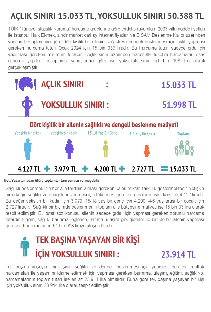 TÜİK (Türkiye İstatistik Kurumu) harcama gruplarına göre endeks rakamları, 2003 yıllı madde fiyatları ile İstanbul Halk Ekmek, zincir market cari ay internet fiyatları ve BİSAM Beslenme Kalıbı üzerinden yapılan hesaplamaya göre dört kişilik bir ailenin sağlıklı ve dengeli beslenmesi için aylık yapması gereken harcama tutarı Ocak 2024 için 15 bin 033 liradır. Bu harcama tutarı sadece gıda için yapılması gereken minimum tutardır. Açlık sınırı üzerinden hanehalkı tüketim harcamaları esas alınarak yapılan hesaplama sonuçlarına göre ise yoksulluk sınırı 51 bin 998 lira olarak gerçekleşmiştir.