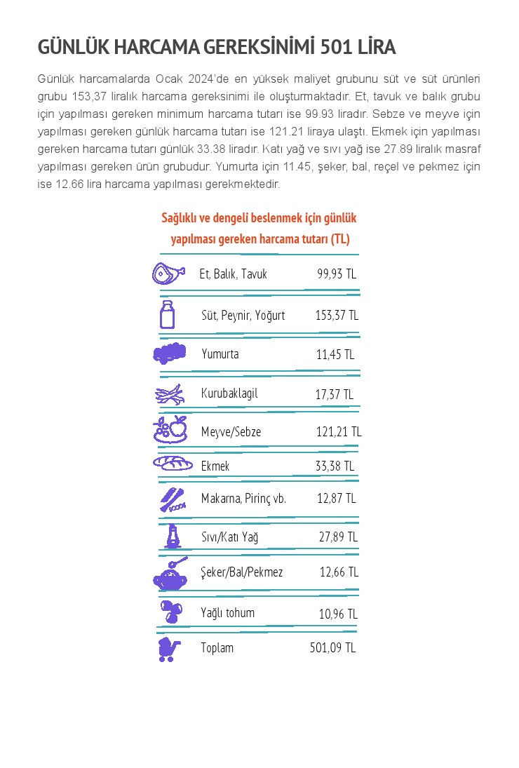 Günlük harcamalarda Ocak 2024’de en yüksek maliyet grubunu süt ve süt ürünleri grubu 153,37 liralık harcama gereksinimi ile oluşturmaktadır. Et, tavuk ve balık grubu için yapılması gereken minimum harcama tutarı ise 99.93 liradır. Sebze ve meyve için yapılması gereken günlük harcama tutarı ise 121.21 liraya ulaştı. Ekmek için yapılması gereken harcama tutarı günlük 33.38 liradır. Katı yağ ve sıvı yağ ise 27.89 liralık masraf yapılması gereken ürün grubudur. Yumurta için 11.45, şeker, bal, reçel ve pekmez için ise 12.66 lira harcama yapılması gerekmektedir.