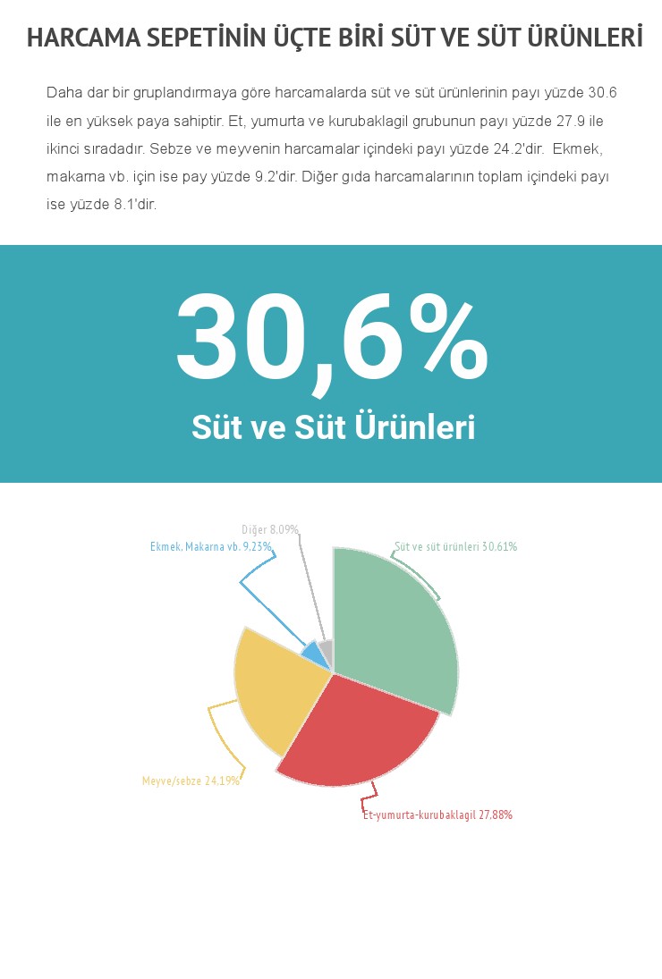 Daha dar bir gruplandırmaya göre harcamalarda süt ve süt ürünlerinin payı yüzde 30.6 ile en yüksek paya sahiptir. Et, yumurta ve kurubaklagil grubunun payı yüzde 27.9 ile ikinci sıradadır. Sebze ve meyvenin harcamalar içindeki payı yüzde 24.2'dir. Ekmek, makarna vb. için ise pay yüzde 9.2'dir. Diğer gıda harcamalarının toplam içindeki payı ise yüzde 8.1'dir.