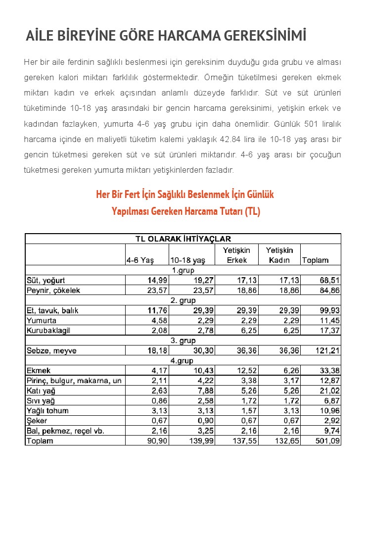 Her bir aile ferdinin sağlıklı beslenmesi için gereksinim duyduğu gıda grubu ve alması gereken kalori miktarı farklılık göstermektedir. Örneğin tüketilmesi gereken ekmek miktarı kadın ve erkek açısından anlamlı düzeyde farklıdır. Süt ve süt ürünleri tüketiminde 10-18 yaş arasındaki bir gencin harcama gereksinimi, yetişkin erkek ve kadından fazlayken, yumurta 4-6 yaş grubu için daha önemlidir. Günlük 501 liralık harcama içinde en maliyetli tüketim kalemi yaklaşık 42.84 lira ile 10-18 yaş arası bir gencin tüketmesi gereken süt ve süt ürünleri miktarıdır. 4-6 yaş arası bir çocuğun tüketmesi gereken yumurta miktarı yetişkinlerden fazladır.