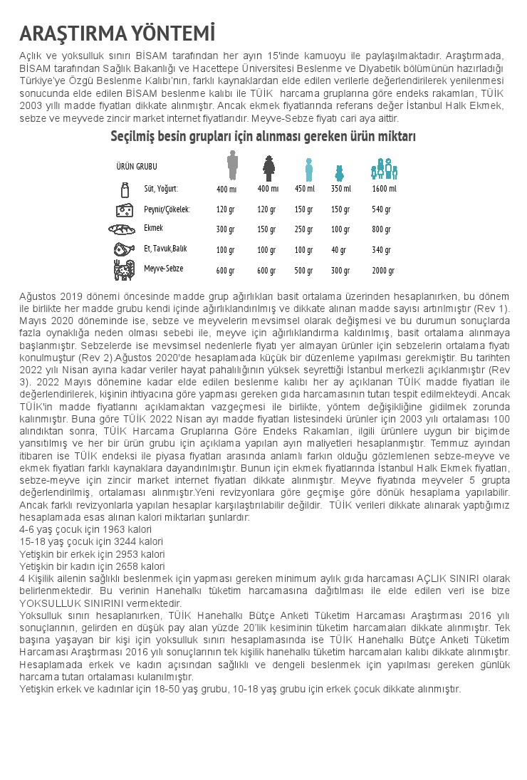 Ağustos 2019 dönemi öncesinde madde grup ağırlıkları basit ortalama üzerinden hesaplanırken, bu dönem ile birlikte her madde grubu kendi içinde ağırlıklandırılmış ve dikkate alınan madde sayısı artırılmıştır (Rev 1). Mayıs 2020 döneminde ise, sebze ve meyvelerin mevsimsel olarak değişmesi ve bu durumun sonuçlarda fazla oynaklığa neden olması sebebi ile, meyve için ağırlıklandırma kaldırılmış, basit ortalama alınmaya başlanmıştır. Sebzelerde ise mevsimsel nedenlerle fiyatı yer almayan ürünler için sebzelerin ortalama fiyatı konulmuştur (Rev 2). Ağustos 2020'de hesaplamada küçük bir düzenleme yapılması gerekmiştir. Bu tarihten 2022 yılı Nisan ayına kadar veriler hayat pahalılığının yüksek seyrettiği İstanbul merkezli açıklanmıştır (Rev 3). 2022 Mayıs dönemine kadar elde edilen beslenme kalıbı her ay açıklanan TÜİK madde fiyatları ile değerlendirilerek, kişinin ihtiyacına göre yapması gereken gıda harcamasının tutarı tespit edilmekteydi. Ancak TÜİK'in madde fiyatlarını açıklamaktan vazgeçmesi ile birlikte, yöntem değişikliğine gidilmek zorunda kalınmıştır. Buna göre TÜİK 2022 Nisan ayı madde fiyatları listesindeki ürünler için 2003 yılı ortalaması 100 alındıktan sonra, TÜİK Harcama Gruplarına Göre Endeks Rakamları, ilgili ürünlere uygun bir biçimde yansıtılmış ve her bir ürün grubu için açıklama yapılan ayın maliyetleri hesaplanmıştır. Temmuz ayından itibaren ise TÜİK endeksi ile piyasa fiyatları arasında anlamlı farkın olduğu gözlemlenen sebze-meyve ve ekmek fiyatları farklı kaynaklara dayandırılmıştır. Bunun için ekmek fiyatlarında İstanbul Halk Ekmek fiyatları, sebze-meyve için zincir market internet fiyatları dikkate alınmıştır. Meyve fiyatında meyveler 5 grupta değerlendirilmiş, ortalaması alınmıştır. Yeni revizyonlara göre geçmişe göre dönük hesaplama yapılabilir. Ancak farklı revizyonlarla yapılan hesaplar karşılaştırılabilir değildir. TÜİK verileri dikkate alınarak yaptığımız hesaplamada esas alınan kalori miktarları şunlardır: