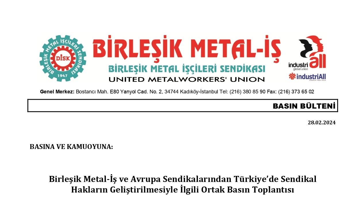 Birleşik Metal-İş ve Avrupa Sendikalarından Türkiye’de Sendikal Hakların Geliştirilmesiyle İlgili Ortak Basın Toplantısı
