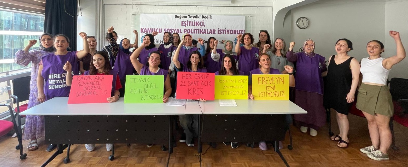 Kadın Komisyonumuz, doğurganlık hızının düşmesi nedeniyle hükümetin gündemine aldığı doğum teşviki paketine ilişkin bir basın toplantısı düzenledi.KMO İstanbul Şubesi’nde 23 Temmuz Salı günü yapılan toplantıda metal işçisi kadınlar, “Doğum teşviki değil; eşitlikçi, kamucu sosyal politikalar istiyoruz. Kadınları ‘doğuma teşvik edeceği’ söylenen önlemlerin kadınların istihdamdaki varlığını, gelirlerini, statülerini etkilemesinden, toplumsal cinsiyet eşitsizliğini daha da derinleştirmesinden endişeliyiz” dedi.Kadınların çalışma yaşamı üzerinde anne olmanın getirdiği olumsuz etkilere dikkat çeken kadın üyelerimiz, “Hükümetin sorumluluğu bu olumsuz etkileri ortadan kaldırmaktır” diye konuştu.Komisyonumuzun açıklaması şu şekilde:Doğum Teşviki Değil,