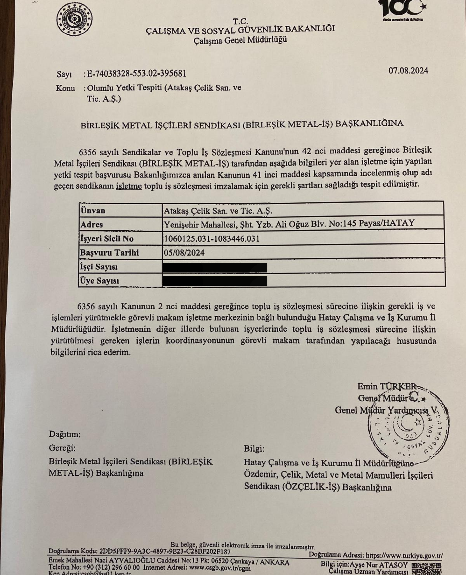 Sendikamız, işyerinde toplu iş sözleşmesi imzalamak için yeterli çoğunluğu sağlayarak 5 Ağustos 2024 tarihinde yetki tespiti için Çalışma ve Sosyal Güvenlik Bakanlığı’na yasal başvurusunu gerçekleştirdi. Bakanlık, Atakaş Çelik işçilerini temsile yetkili sendika olduğumuzu 7 Ağustos 2024 tarihinde verdiği “olumlu yetki tespiti” belgesiyle resmileştirdi.