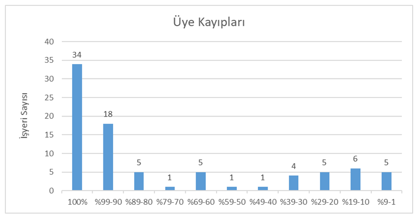 Davası sonuçlanan toplam 115 işyeri veya işletmeden 85’inde üye kaybı, 30 işyeri veya işletmede ise üye artışı yaşanmıştır. Üye kayıplarının oranlarına ilişkin tablo aşağıdaki gibidir: