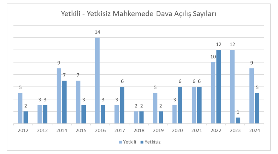 - 2024 yılında açılan 14 davadan 5’i yetkisiz mahkemede ikame edilmiştir. Yani davaların yüzde 35,71’i yetkisiz mahkemede açılmıştır.