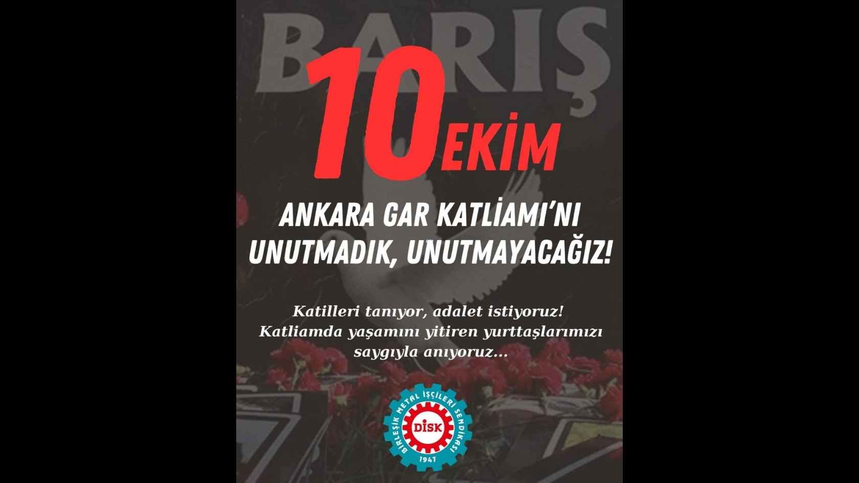 10 Ekim 2015 günü Ankara Tren Garı kavşağında DİSK, KESK, TMMOB ve TTB’nin düzenlediği “Emek, Barış ve Demokrasi Mitingi”ne gidenlerin bulunduğu bölgede IŞİD’li teröristler tarafından düzenlenen bombalı saldırılarda, yüreği barış ve kardeşlik özlemiyle dolu 104 yurttaşımız hayatını kaybetti, 500’e yakın yurttaşımız da yaralandı.