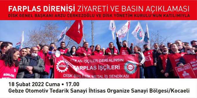 DİSK Genel Başkanı Arzu Çerkezoğlu ve DİSK Yönetim Kurulu üyeleri 18 Şubat Cuma günü saat 17.00’de Gebze’de fabrika önünde direnişlerini sürdüren işçilerle bir araya gelecek