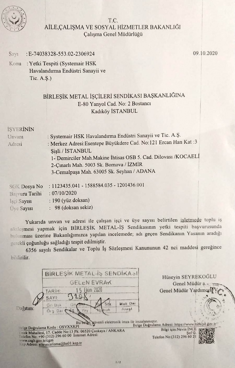 Şirket yönetimi yaptığı açıklamada sendikamızın üye sayısı olarak işyerinde yeterli çoğunluğu sağlamadığını, Bakanlığa kendilerine sadece sendikamızın işyerinde yetki tespiti isteminde bulunduğunu bildirdiğini ifade etmektedir. Oysa sendikamız işyerinde 6356 sayılı yasanın aradığı yeterli üye çoğunluğunu sağlamış, Çalışma, Aile ve Sosyal Güvenlik Bakanlığı’na bu çoğunluğu kayıtlardan tespit etmesi için 9.10.2020 tarihinde başvuruda bulunmuş, Bakanlık incelemesini tamamlayarak işyerinde sendikamızın işçileri temsil etmek için yasanın aradığı üye çoğunluğuna sahip olduğuna dair “çoğunluk tespit belgesini” 15.10.2020 tarihinde tarafımıza iletmiştir.