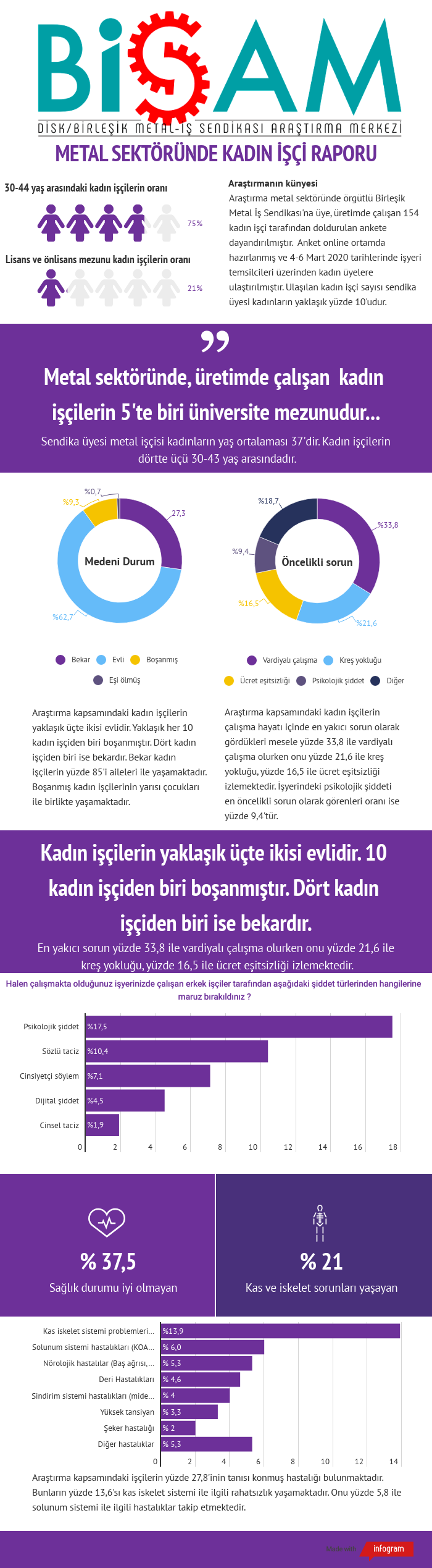 Bu araştırma metal sektöründe örgütlü Birleşik Metal İş Sendikası'na üye, üretimde çalışan 154 kadın işçi tarafından doldurulan ankete dayandırılmıştır. Araştırmanın ana kütlesi toplu sözleşme kapsamındaki Birleşik Metal İş Sendikası üyesi kadınlardır.