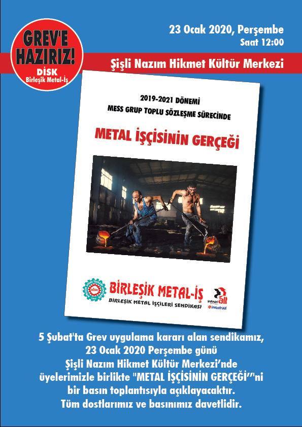 Genel Yönetim Kurulumuz ve metal işçilerinin katılımıyla 23 Ocak 2020 Perşembe günü gerçekleştirilecek olan basın toplantısında "Metal İşçisinin Gerçeği" raporu kamuoyu ile paylaşılacaktır.