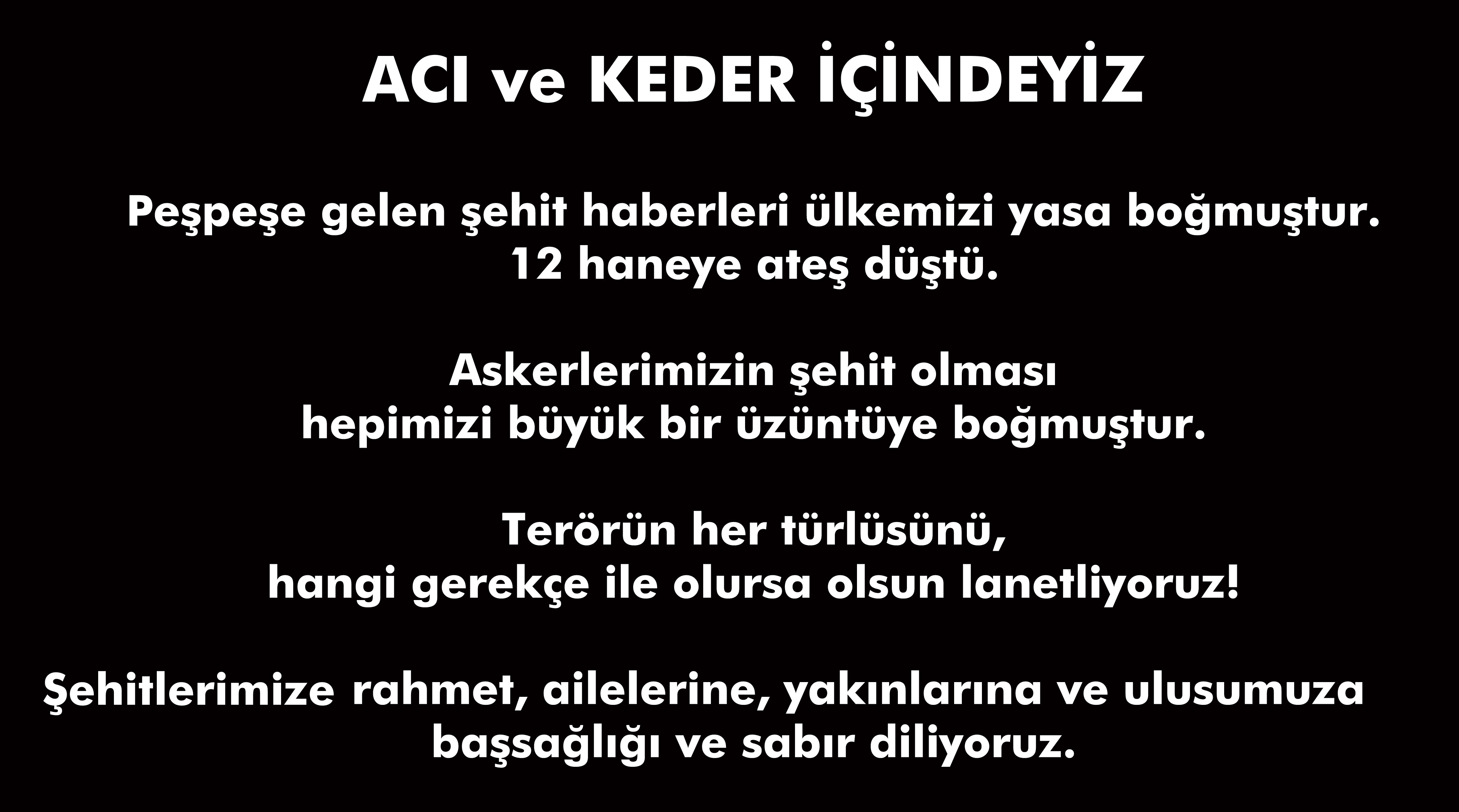 Şehitlerimize rahmet, ailelerine, yakınlarına ve ulusumuza başsağlığı ve sabır diliyoruz.