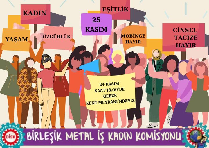 Metal İşçisi Kadınlar “Kadın, Yaşam, Özgürlük, Eşitlik” sloganlarıyla "Kadına Yönelik Şiddete Karşı Uluslararası Mücadele Günü" için 24 Kasım Cuma günü, saat: 18.00’de Gebze Kent Meydanı’nda buluşuyor…