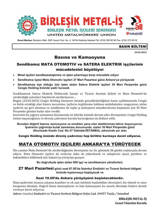 Mata Otomotiv işçileri 27 Mart Pazartesi günü Ankara’ya yürüyecek, Satera Elektrik işçileri 30 Mart Perşembe günü Cengiz Holding önünde çadır kuracak.