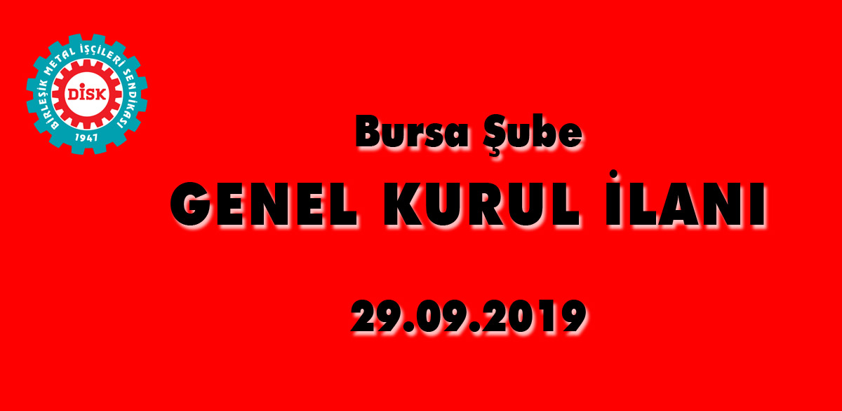 BİRLEŞİK METAL İŞÇİLERİ SENDİKASI, (Birleşik Metal İş) Bursa şubemizin 7. Olağan Genel Kurulu, 29.09.2019 Pazar günü, 10.00 – 17.00 saatleri arasında, “Yiğitler Mah. Otosan Sit. İş Merkezi Kat 3 Yıldırım - Bursa (SALON KARDELEN)” adresinde, aşağıda yazılı gündem ile toplanacaktır.
