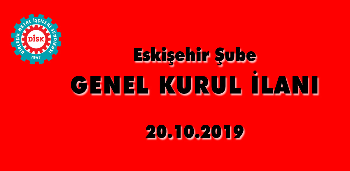 BİRLEŞİK METAL İŞÇİLERİ SENDİKASI, (Birleşik Metal İş) Eskişehir şubemizin 4. Olağan Genel Kurulu, 20.10.2019 Pazar günü, 10.00 – 17.00 saatleri arasında, “Yenibağlar Mah. Yorulmaz sok. No: 1 TEPEBAŞI- ESKİŞEHİR (ALAPARK DAVET SALONU)” adresinde, aşağıda yazılı gündem ile toplanacaktır.