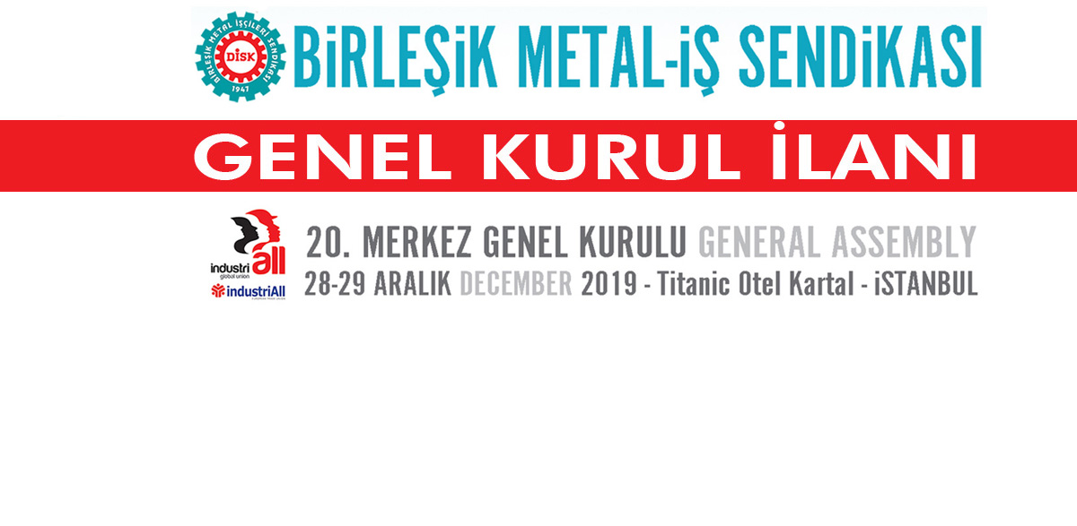BİRLEŞİK METAL İŞÇİLERİ SENDİKASI, (Birleşik Metal İş) Genel Merkez 20. Olağan Genel Kurulu, 28-29 Aralık 2019 günleri, 09.00 – 22.00 saatleri arasında, “Orta mahalle Kaptan-ı Derya Cad. No: 37/1 Soğanlık Kartal-İstanbul (TİTANİC BUSINESS OTEL)” adresinde, aşağıda yazılı gündem ile toplanacaktır.