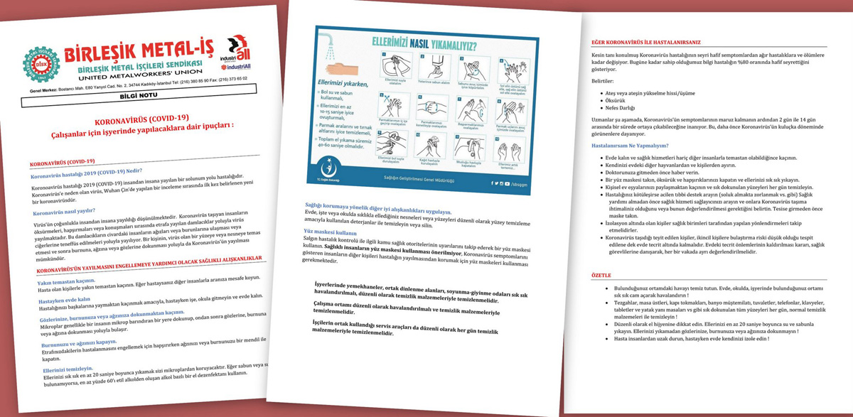 Sendikamız, Koronavirüs (Covid-19) hakkında, Çalışanlar için işyerinde yapılacaklara dair ipuçlarını içeren bir bilgi notu yayınladı.