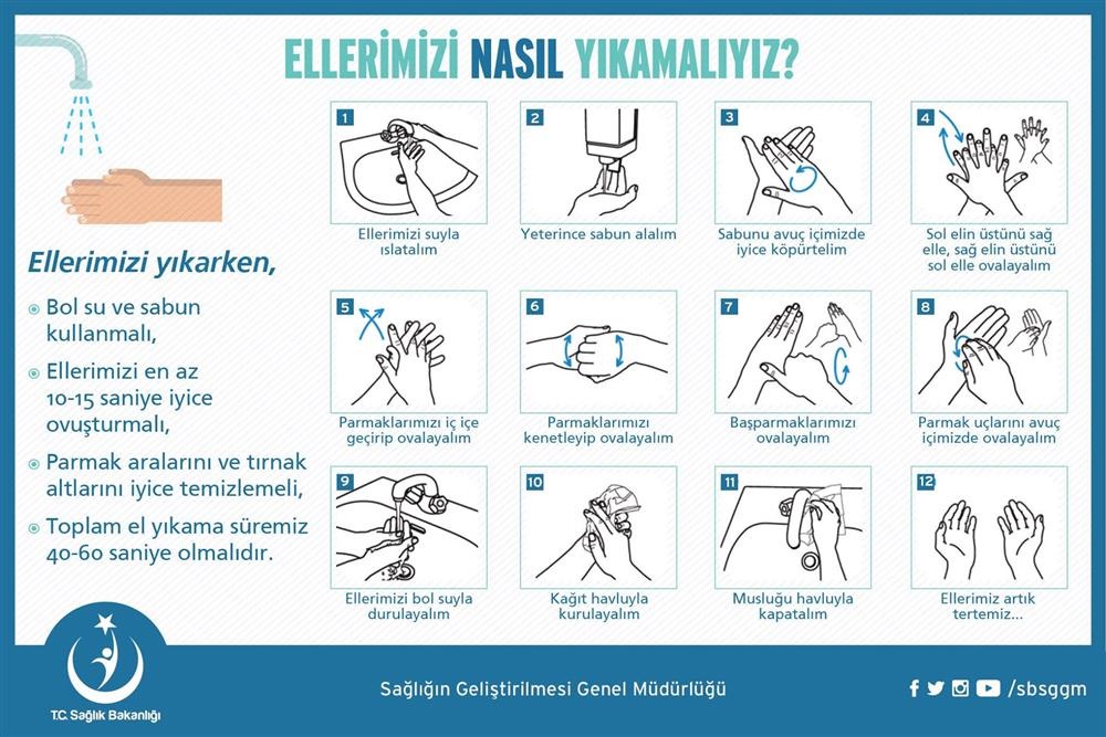 - Düzenli olarak el hijyenine dikkat edin. Ellerinizi en az 20 saniye boyunca su ve sabunla yıkayın. Ellerinizi yıkamadan gözlerinize, burnunuza veya ağzınıza dokunmayın !