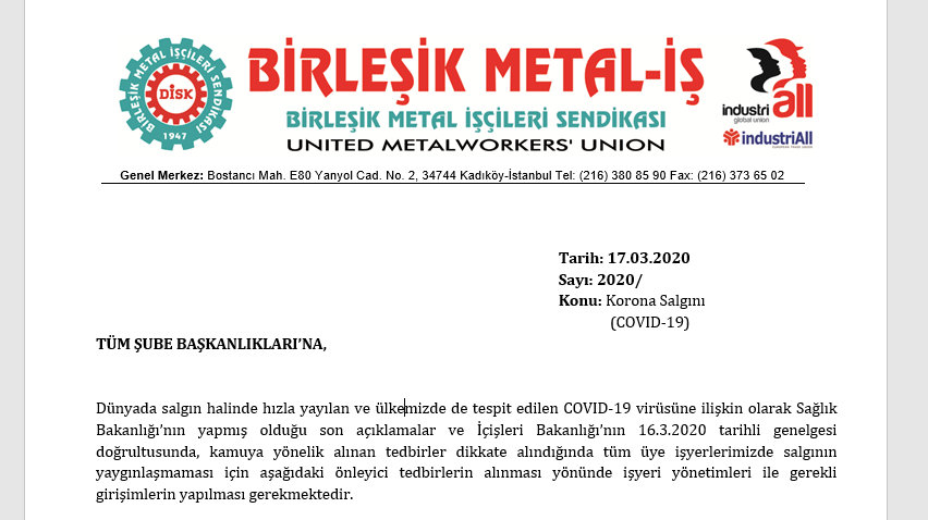 Dünyada salgın halinde hızla yayılan ve ülkemizde de tespit edilen COVID-19 virüsüne ilişkin olarak Sağlık Bakanlığı’nın yapmış olduğu son açıklamalar ve İçişleri Bakanlığı’nın 16.3.2020 tarihli genelgesi doğrultusunda, kamuya yönelik alınan tedbirler dikkate alındığında tüm üye işyerlerimizde salgının yaygınlaşmaması için aşağıdaki önleyici tedbirlerin alınması yönünde işyeri yönetimleri ile gerekli girişimlerin yapılması gerekmektedir.
