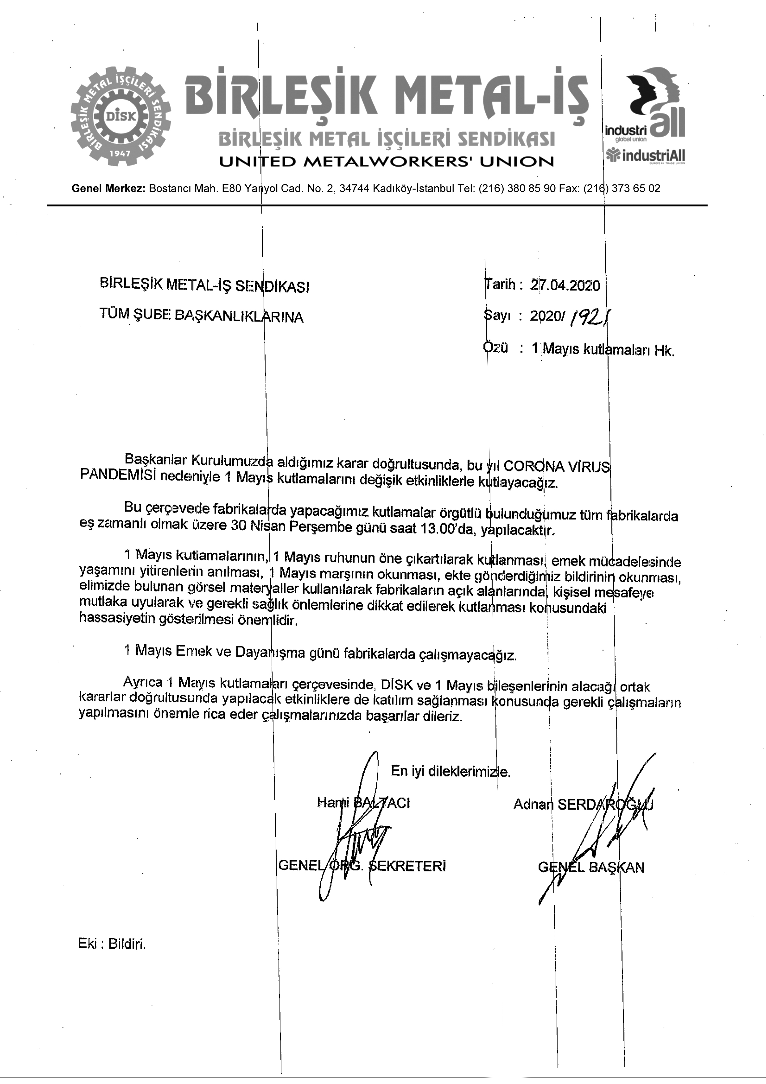 1 MAYIS 2020 BİLDİRGESİ