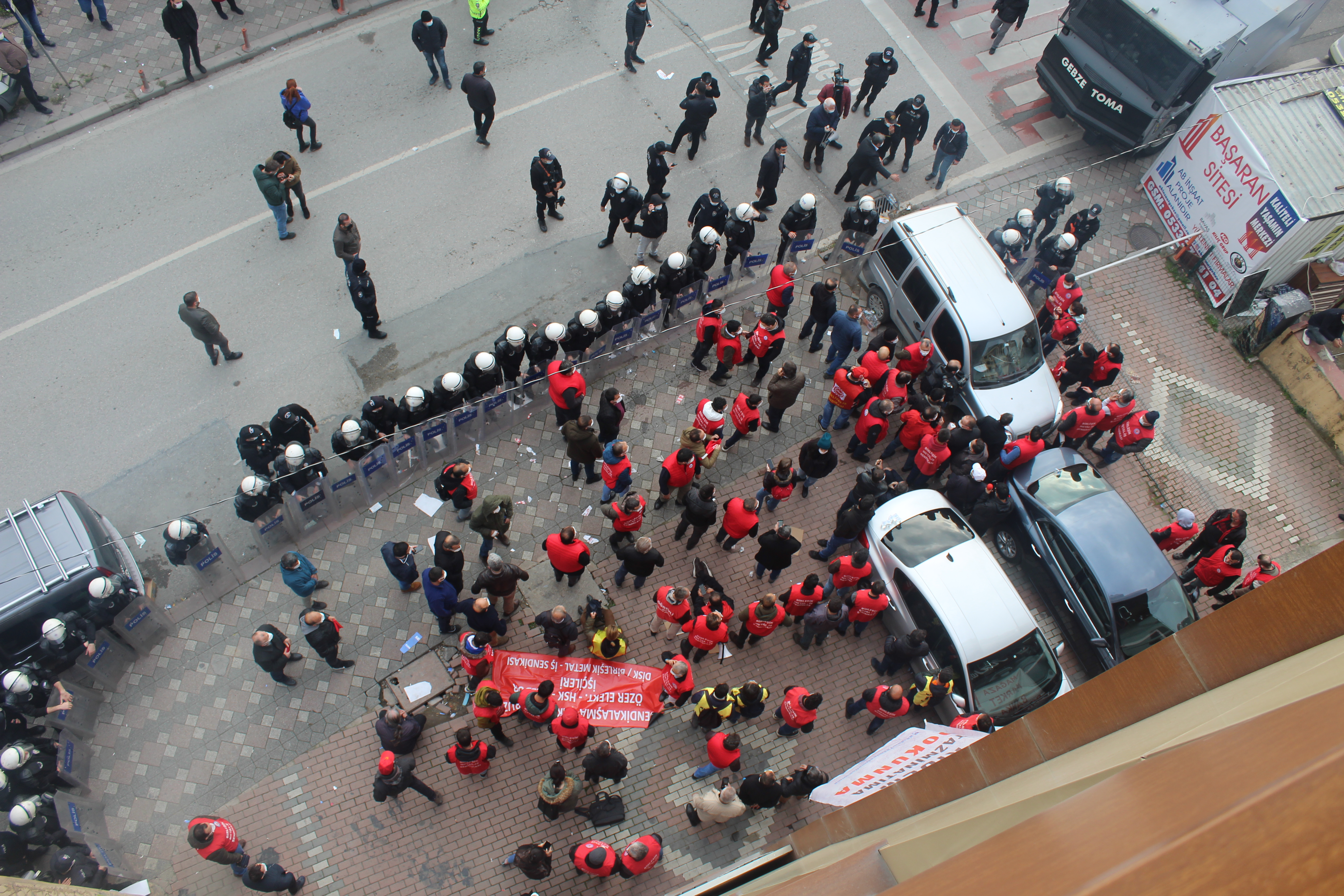 Genel Başkanımız Adnan Serdaroğlu'nun açıklamasının ardından, polis müdahale ederek işçileri küçük bir alana sıkıştırdı ve gözaltılara başladı.. Bu arada darp edilen yöneticilerimiz , işçiler ve dayanışmaya gelen emek dostları oturma eylemine başladılar. Gözaltındakilerin serbest bırakılması ve yürüyüşe izin verilmesi için, vardiyalardan çıkan metal işçileri de şubeye doğru gelmeye başladı.