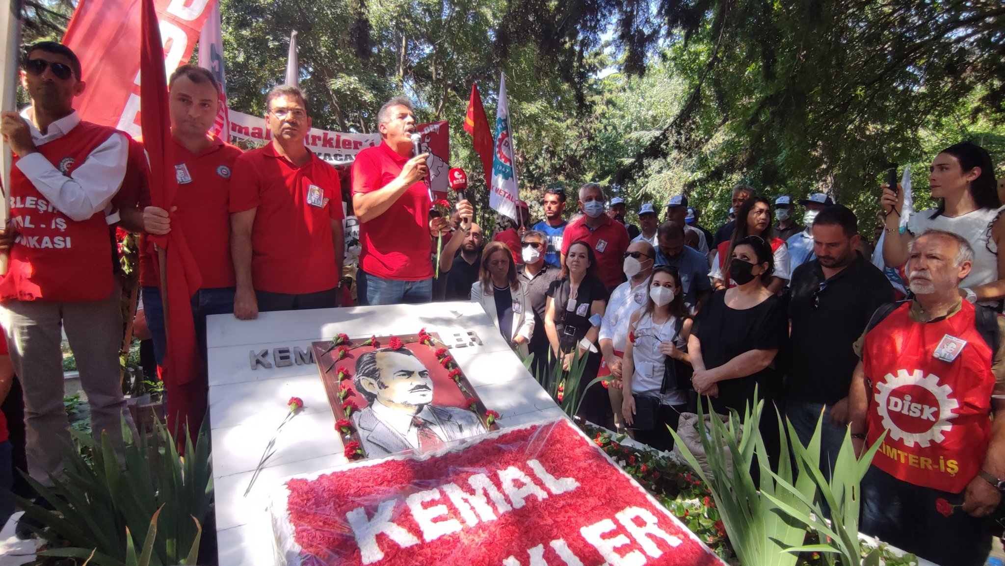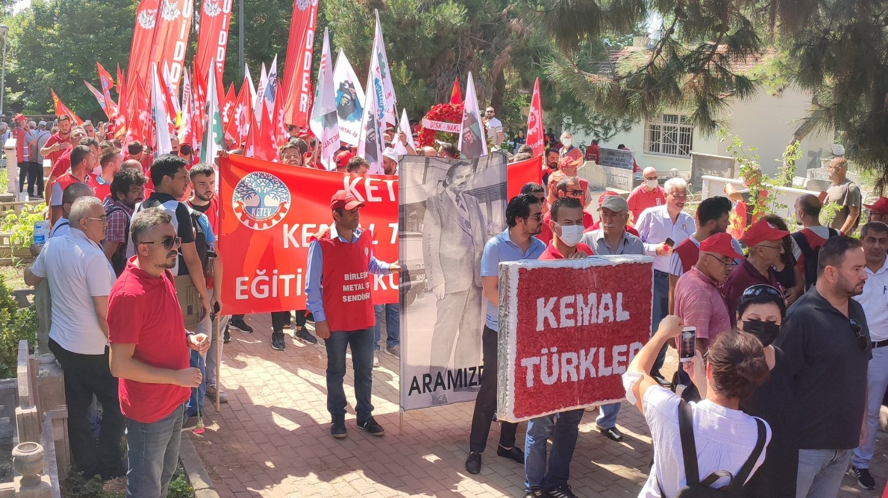 Sloganlarla Kemal Türkler’in mezarına yaptığımız yürüyüşün ardından, mezar başında saygı duruşu yapıldı. Ardından, DİSK Genel Başkanı Arzu Çerkezoğlu, Genel Başkanımız Adnan Serdaroğlu ve Kemal Türkler’in kızı Nilgün Soydan Türkler tarafından konuşmalar yapıldı.