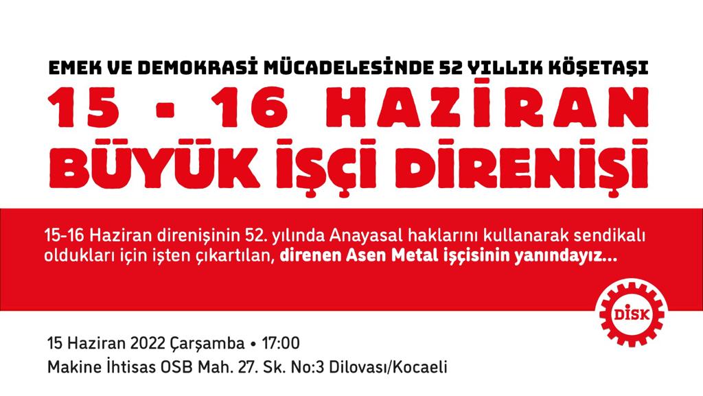 15-16 Haziran direnişinin 52. yılında Anayasal haklarını kullanarak sendikalı oldukları için işten çıkartılan, direnen Asen Metal işçilerinin yanındayız...