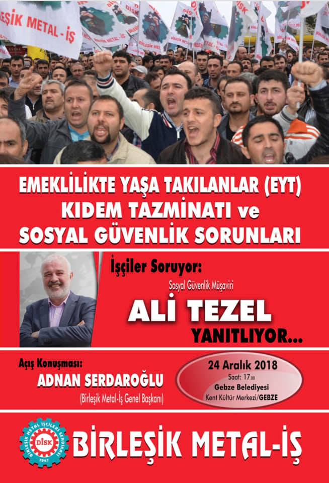 Birleşik Metal İş Sendikası olarak Gebze'de 24.12.2018 tarihinde yapılacak olan; üyelerimizin ve milyonlarca işçinin mağdur olduğu Emeklilikte Yaşa Takılanlar, Kıdem tazminatı gaspı ve sosyal güvenlikte gelinen son aşama gibi konuların ele alınacağı toplantıya tüm üyelerimizi ve dostlarımızı davet ediyoruz.