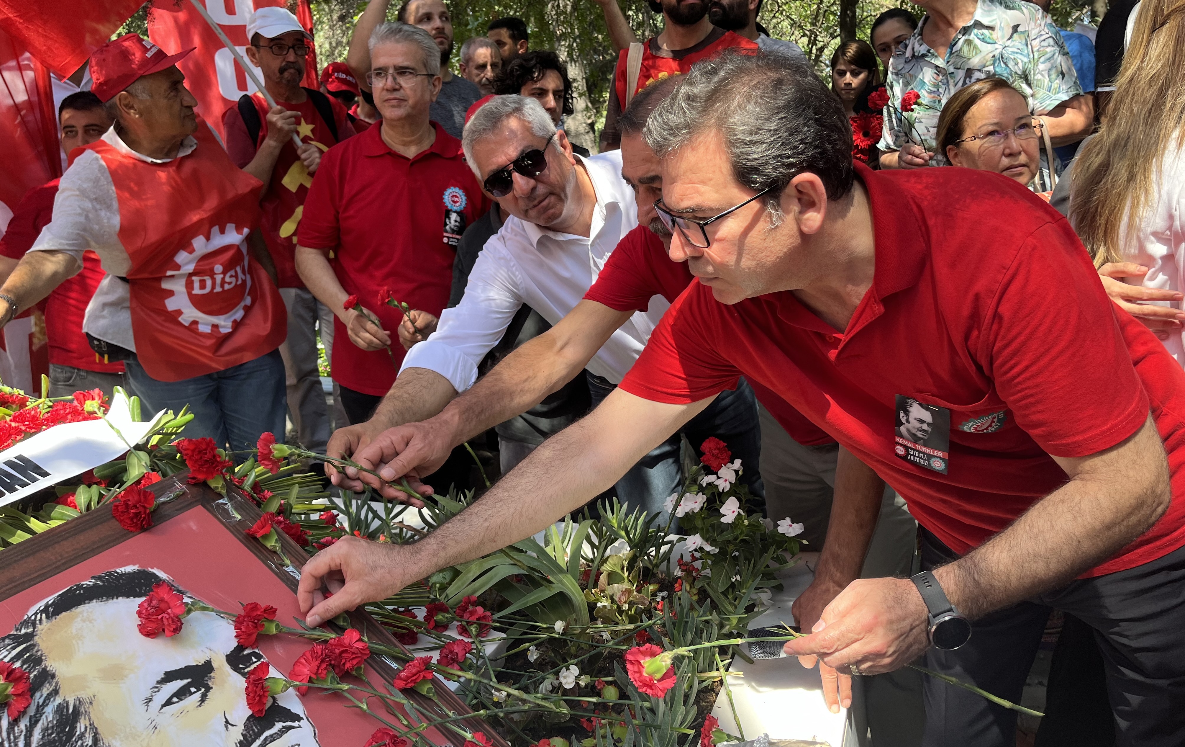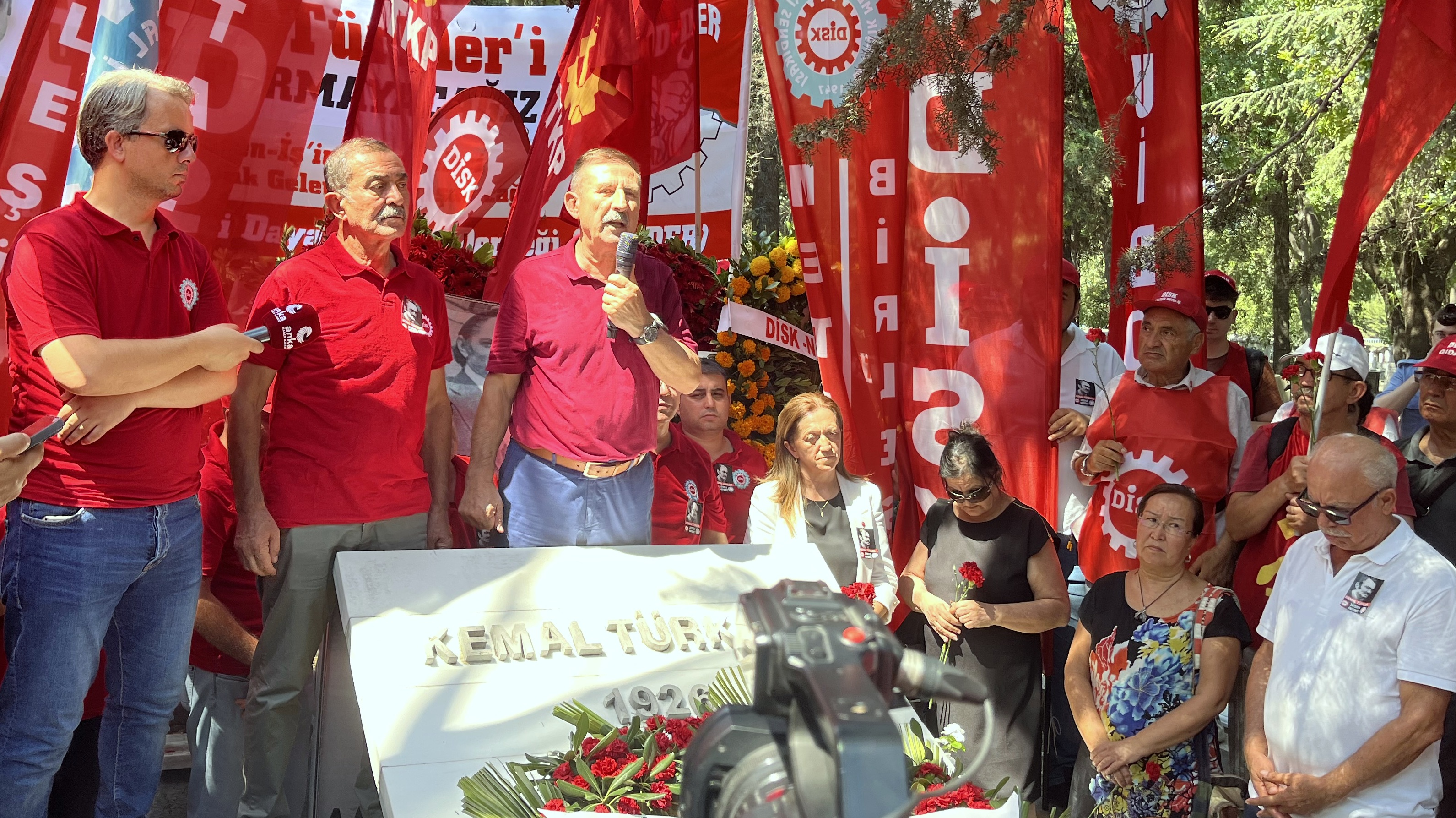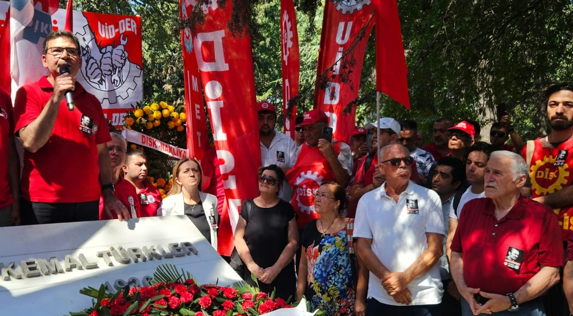 Ardından Konfederasyonumuz DİSK’in Genel Başkanı Arzu Çerkezoğlu, “Kemal Türkler'e sıkılan kurşun, bugün bize yaşatılmak istenen Türkiye'nin işaretidir. Bugün, gelirde, vergide adaletsizliğin arttığı, işçi açlık sınırının altındaki asgari ücrete mahkum edildiği, emeklilerin 10 bin lirayla yaşamaya mahkum edildiği, en temel kazanılmış haklarımızın, kıdem tazminatı başta olmak üzere kuşa çevrildiği, yok edilmeye çalışıldığı bir süreç bize dayatılmak isteniyor. Bizler Kemal Türkler'in ve bütün arkadaşlarının, yoldaşlarının açtığı yoldan, bize dayatılan bu düzeni değiştirme mücadelesini büyütüyoruz” ifadelerini kullandı.