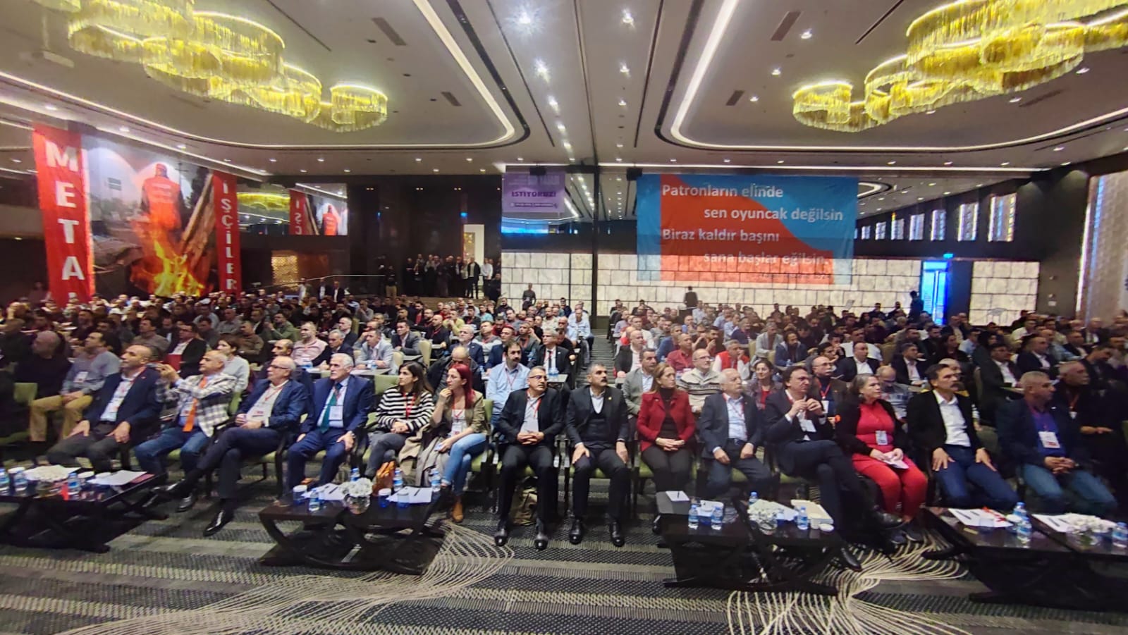 Kongrenin ikinci gününde, delegasyonumuz “Kemal Türkler kavgamızda yaşıyor”, “Metal işçisi direnişin simgesi”, “Birleşe birleşe kazanacağız” sloganlarıyla salona girdi.