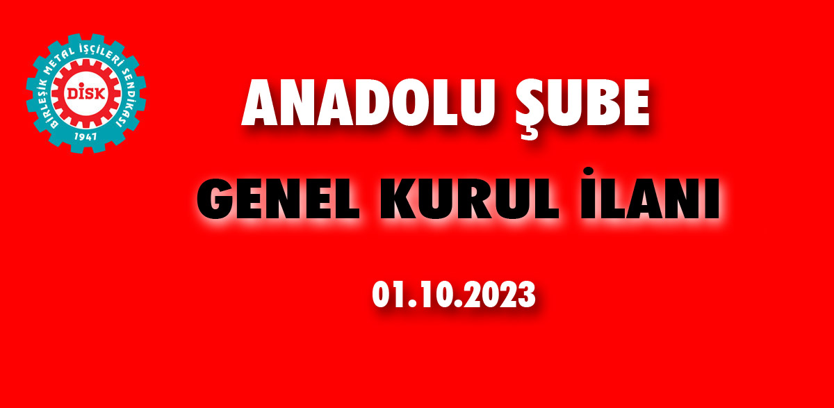 BİRLEŞİK METAL İŞÇİLERİ SENDİKASI, (Birleşik Metal İş) Anadolu şubemizin 8. Olağan Genel Kurulu, 01.10.2023 Pazar günü, 10.00-17.00 saatleri arasında, “HOTEL İÇKALE, GMK