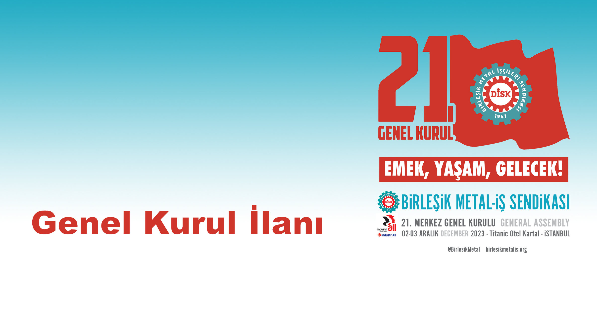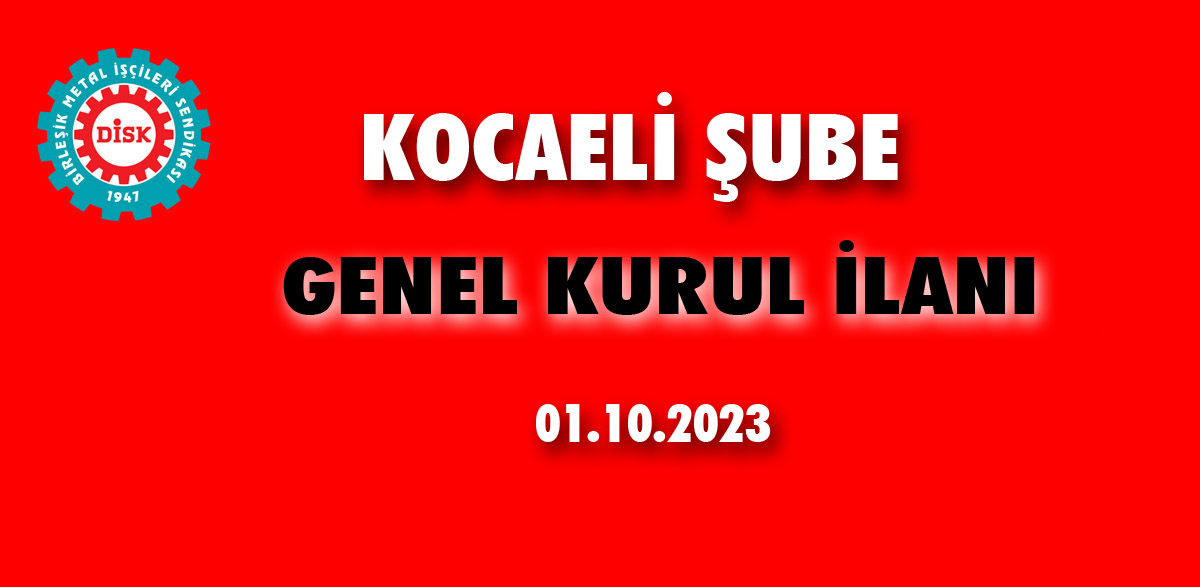 BİRLEŞİK METAL İŞÇİLERİ SENDİKASI, (Birleşik Metal İş) Kocaeli şubemizin 15. Olağan Genel Kurulu, 01.10.2023 Pazar günü, 10.00-17.00 saatleri arasında, “NECATİ GENÇOĞLU