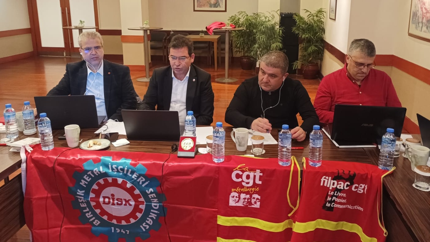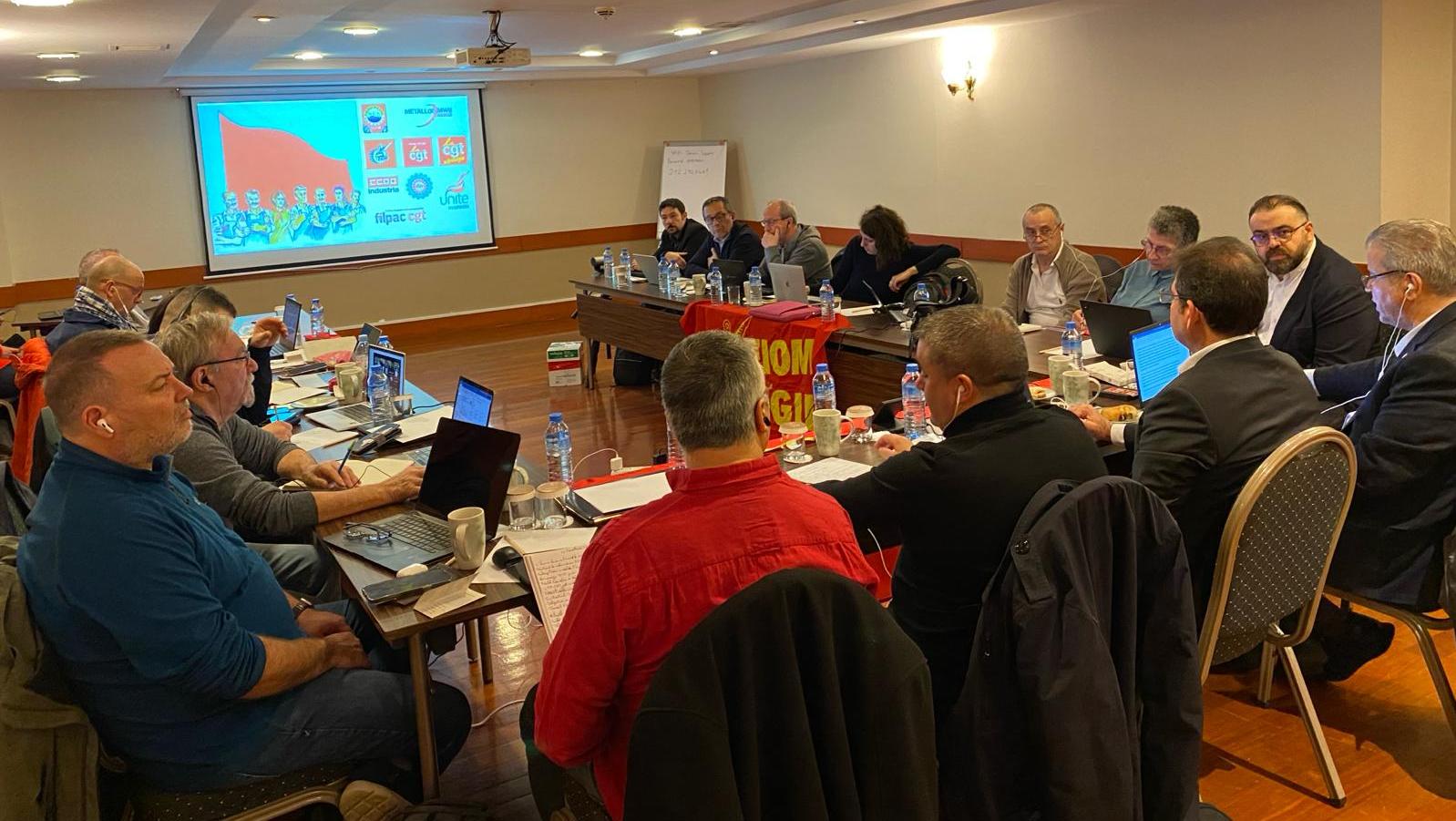 Toplantıya katılan CGT-FTM, CGT-FILPAC, CGT-FNME (Fransa), CGTP Fiquemetal (Portekiz), CGIL-FIOM (İtalya), FGTB-MWB (Belçika) ve CC.OO Industria (İspanya) sendikalarının yöneticilerine, Genel Başkanımız Özkan Atar ve Genel Sekreterimiz Ali Çeltek, Türkiye’de sendikal hareketin durumu ve Avrupa çapında nasıl bir ortak mücadelenin örülebileceğine ilişkin bir sunum yaptı.
